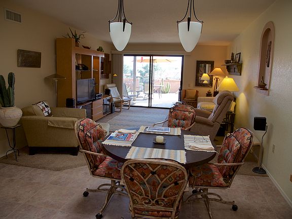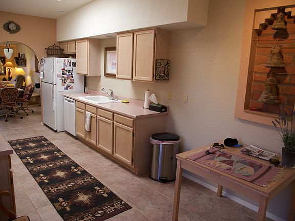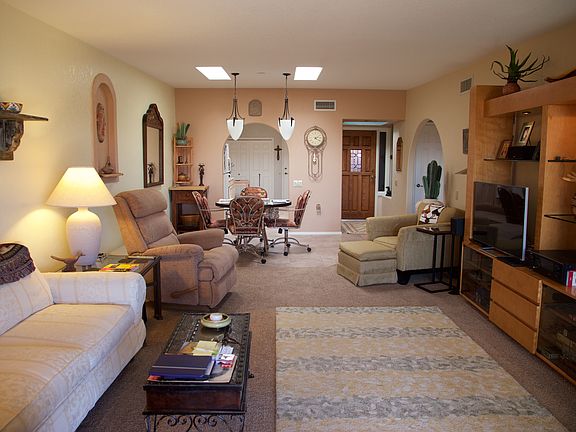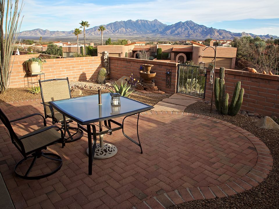 Enjoy awesome panoramic views of the Santa Rita Mountains form your living room and patio. Take in sunset and sunrise while enjoying the gentle flow of your fountain. Slip into the covered portion of the patio for some cool shade. This home has had many upgrades in the past year or so. The kitchen ceiling was raised with all new lighting. New lighting also adorns the dining area. Carpet in the living room and bedrooms and 18inch tile throughout the rest of the house were recently done. New executive height custom vanities highlight the 2 bathrooms. 1 year old appliances include a whole house water filter, water softener, washer, and microwave. The quiet Bosch dishwasher is brand new as is the programable thermostat. You’ll enjoy the abundant light from 2 south facing sliders and 7 skylights. The floor plan is quite open flowing from kitchen to dining area to living room. The kitchen has plenty of storage and work space and a dine in nook. Take in the master bedroom with its walk in closet and slider to the patio. Enjoy your 2 stall attached garage with electric door opener, large built in storage units and workbench. There is also a shed for extra storage. All the benefits of Green Valley Recreation are close at hand with Canoa Hills Recreation Center (pool, hot tub, fitness center, etc.) a 10 minute walk away. All appliances are included : whole house water filter, water softener, washer, dryer, garbage disposal, Bosch dishwasher, refrigerator, double oven, flattop cooking range, microwave. Some furnishings may be available if desired.
