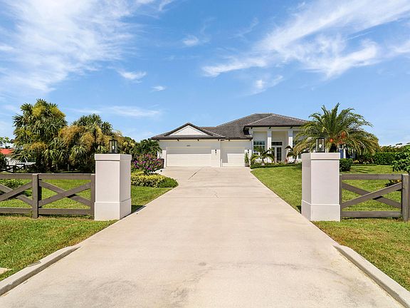 This breathtaking estate home located in Palm Beach Country Estates offers an unparalleled blend of luxury and comfort, featuring 4 spacious bedrooms, 4.5 elegantly appointed bathrooms, an office/den, and a 3 car-garage. Nestled on a sprawling acre of land, this residence boasts a resort-like pool that promises endless days of relaxation and entertainment. As you step inside, you are greeted by a grand open-concept floor plan that seamlessly connects the dining and family rooms, perfect for both intimate and large gatherings. The beautifully designed kitchen features Viking appliances, a large quartz island with countertop seating and is adjacent to the elegant living room adorned with built-in bookcases and cozy fireplace. Every corner of this home exudes casual luxury with its soaring ceilings, exquisite finishes, custom millwork and special designer touches make this home stand out from the rest. The large sliding doors flood the interior with lots of natural light and lead you to a covered patio and summer kitchen ideal for alfresco dining and outdoor entertaining. Your private paradise is complete with a sparkling saltwater pool and paved fire pit area. Beyond the beauty of the home itself, the community offers exceptional amenities, including bike paths leading to the scenic Riverbend Park, a playground for endless fun, and pickleball courts for the sports enthusiasts.
