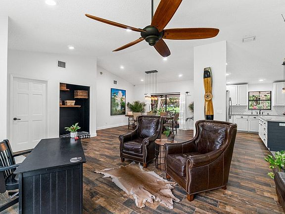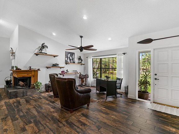 Stunning 3bd 2ba 2 car garage home w/pool on 1 1/4 acres in Jupiter Farms! This tropical paradise home features faux wood tiled floors thru out w/cathedral ceilings, formal living & dining, kitchen w/quartz counter tops & island overlooking family room & real wood burning fireplace. Split floor plan w/large master, bathroom w/marble, large walk in shower and closets both bathrooms updated, w/tub/shower combo in second bathroom. Step outside to enjoy resort style pool, large covered patio w/summer kitchen, designer tree house, two large sheds w/nature path thru lushly landscaped yard w/sprinkler systems! UV Light installed in A/C ducts 2020 Pool salt system 2020 Fully fenced yard w/automatic gate
