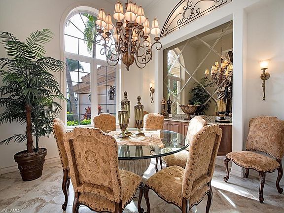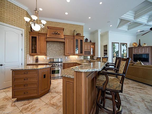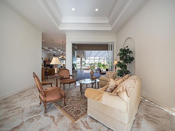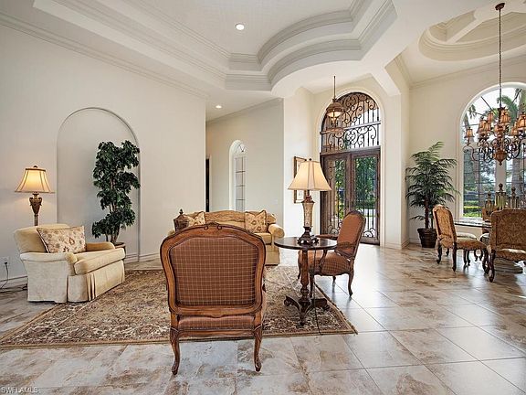 This remarkable residence sits on an over sized lot at the end of the cul de sac and boasts an abundance of designer appointments creating the perfect balance of elegant comfortable luxury complete with surrounding lake views offering serene privacy reminiscent of an island oasis. Volume ceilings highlighted by crown moldings along with coffered and tray detail, extensive windows, arched passageways, and gorgeous natural stone flooring are found throughout this exceptional residence. Top of the line built in appliances in the open gourmet kitchen along with the full service wet bar including a wine cooler help to create endless entertaining possibilities. Retreat to the master suite with a sitting area in the relaxing master bedroom. The spa inspired master bathroom is complete with his and hers vanities, custom mirrors, a free standing tub and walk through shower. Enjoy the tropical Florida sunshine from the expansive professionally landscaped lanai lounging around the sparkling pool and spill over spa. Casual outdoor entertaining is a breeze with the covered summer kitchen and loggia gathering areas. VIEWS OF THIS HOME ARE SURROUNDED BY WATER. A SHOW STOPPER.