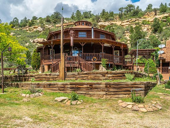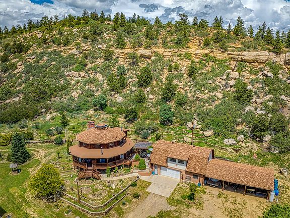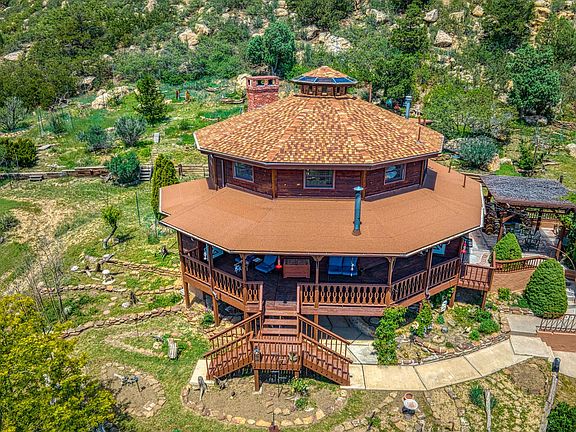 Nestled in a serene hidden valley between rocky hills...80 acres of lush meadow & healthy forest surround this unique custom mountain home. - You'll be amazed as the elk are by the studiously maintained, park-like setting. The home itself is more than impressive too with a rounded design unlike anything you've seen before! Floor-to-ceiling bookcases, stone fireplace & custom woodworking throughout, are just a few of our favorite things here. Get back outside and enjoy the large covered deck & patio with peaceful water feature. Terraced flowerbeds, garden spaces, Christmas Trees & mature landscaping are all watered from rain collected in a 10k gal. underground cistern. Garage with shop & living space above plumbed for water & septic. No HOA and hunting is allowed. Call