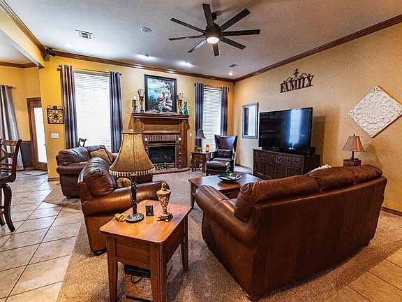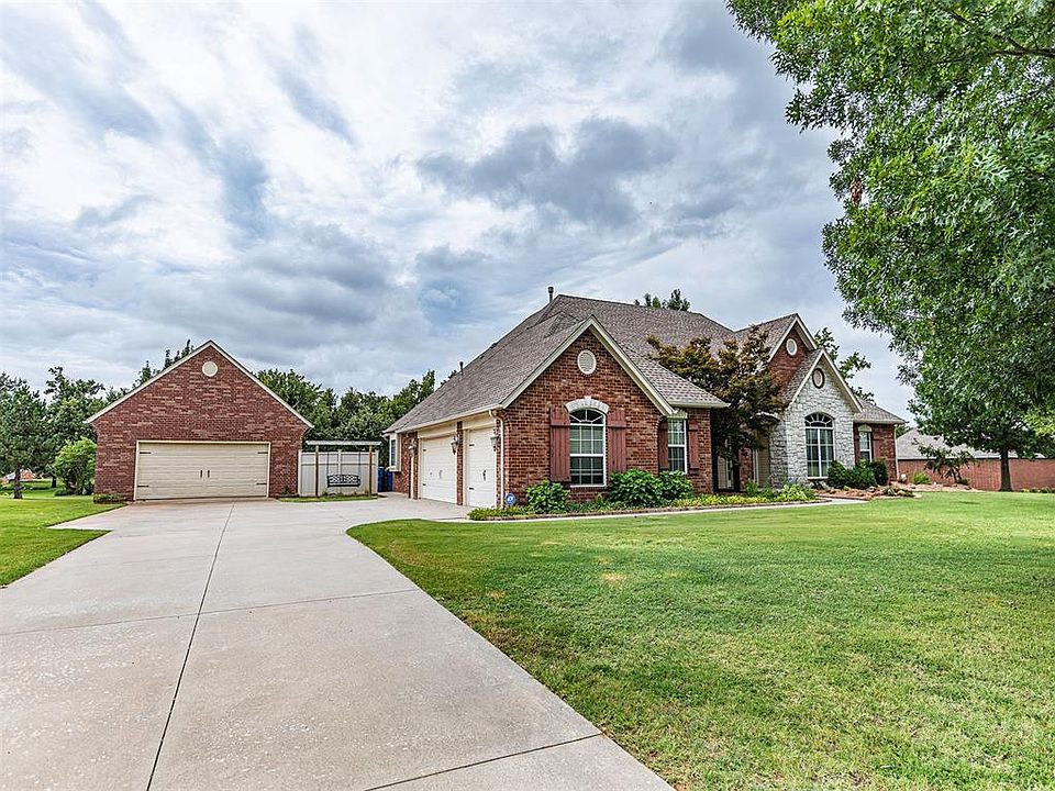 Gorgeous home within the desired Stonegate Crossing subdivision with an open floor plan and rooms for everything you need. The study can be used as a 4th bedroom and the formal dining could double as another living area. Kitchen has stainless steel appliances, granite counter tops, mobile island, large pantry, tons of cabinets and counter space, built-in stove and convection oven. Secondary bedrooms have a jack-n-jill bathroom and large walk-in closets. Large master bedroom with nice master suite and huge walk-in closet. Master bedroom also has access to the patio. Property has a 3-car attached garage and a 24’ x 40’ 4-car detached garage/shop. Shop/detached garage has a tall open ceiling, electric, 1/2 bath, shelving, cabinets, loft storage areas, and 2 overhead garage doors. Well pump new in 2017 & pressure tank new in 2023. Storm shelter in backyard. All this on an amazing 1 acre (MOL) lot!