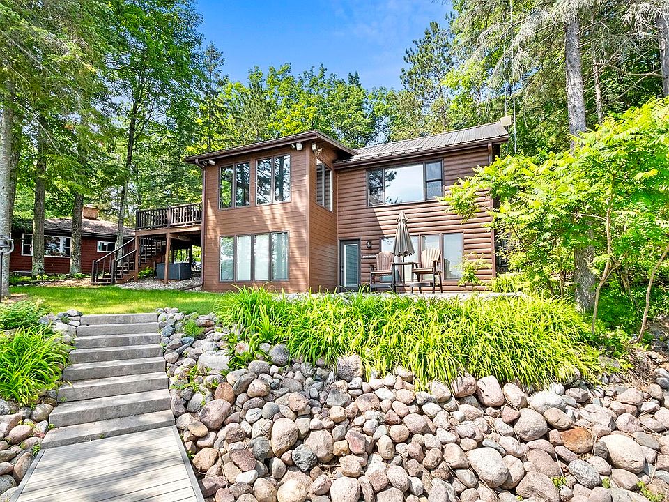 Stunning Northwoods retreat ideal for year-round living or vacation get-away offering an expansive deck for entertaining, relaxing paver patio for beautiful water views, firepit area + 2 private docks for fishing or parking your watercraft and located only 2 minutes to the nearest public boat launch. 84' of prime sandy bottom shore on Archibald Lake with docks, boat lift and kayaks included. Open concept living room w/hardwood flooring & gas fireplace. Stainless steel applianced kitchen w/granite & center island. Full walk-out lower level w/finished family room, primary bedroom & full bath. Tranquil lakes views from almost every room. Whole house generator included. Expansive list of updates. 2.5 car detached garage. .48 Private wooded acres. Please allow 48 hours for binding acceptance.