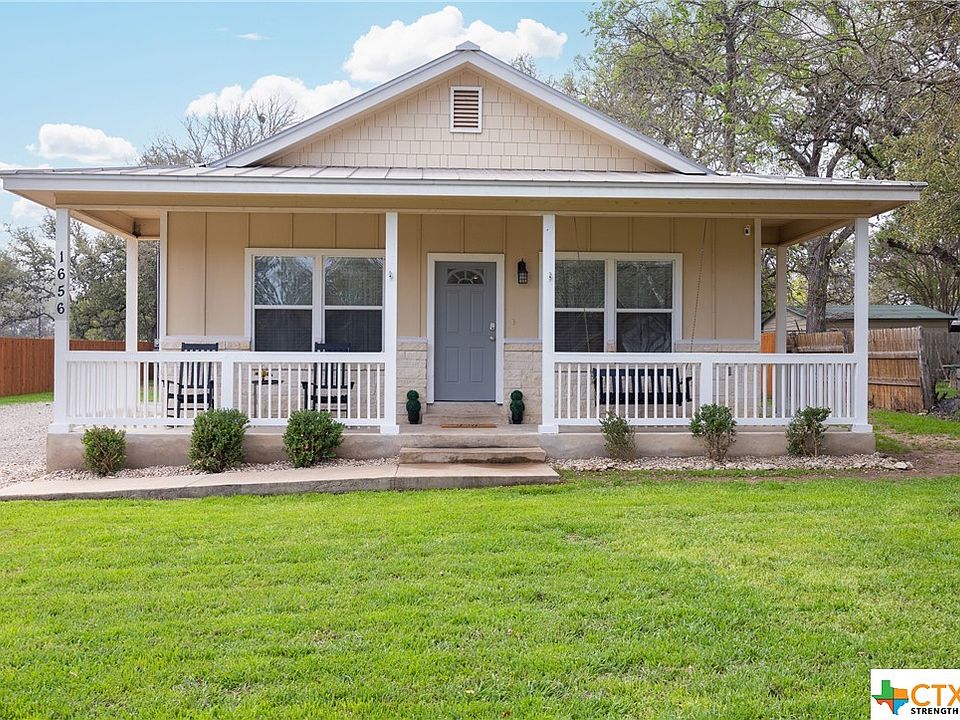 Enjoy easy living in this quiet hill country neighborhood, only minutes from Canyon Lake. This single story, craftsman style home has been designed with low maintenance in mind starting with the metal roof. There is no carpet in the house; all of the flooring is wood laminate with tile in the wet areas. An eat-in kitchen is open to the family room and features long granite counter tops, crisp white cabinets, glass tile backsplash, stainless appliances, a large pantry and a convenient breakfast bar. A generous walk in closet, tall windows, granite countertops and a walk in shower with large, rectangular tiles are smart choices for the owner’s retreat. There are two other bedrooms that share a full bath; also with granite countertops. There’s plenty to do outside on this oversized, .3 acre lot. Enjoy swapping stories around the fire pit, gardening, playing yard games or simply relaxing on your front porch swing. For RV enthusiasts and guests, there is an RV hookup already in place. In addition to being minutes from the lake and boat ramp number 23, this home is nestled in between several popular cities. San Antonio, Austin, New Braunfels, Boerne, Wimberley, San Marcos and Blanco are all within an hour’s drive. As a bonus, Short Term Rentals are allowed. Don’t miss this sweet opportunity to live in Canyon Lake, enjoy the property as a vacation getaway or use it for rental income.