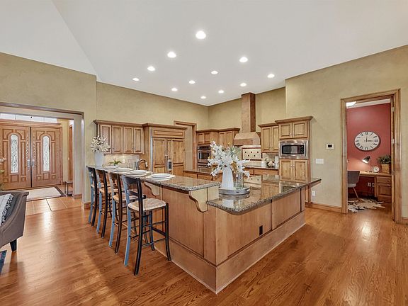 Beautiful custom built home that sits on over an acre lot in Hunters Pointe and be sure to watch the attached Drone Virtual tour. This home is Perfect for entertaining inside and out with over 6000 sq ft that consists of 6 bedrooms, 4 1/2 baths, 3 car heated garage with a 2 car heated detached garage with bathroom, work bench and unfinished loft, oversized saltwater pool (46x20) with sun shelf and a heating and cooling system, pool autocover, stamped concrete backyard patio, firepit, large covered deck, luxury master onsuite and so much more. Custom bilut master closet with mulitple built ins and island dresser, all bedrooms are generously sized with very large closets. Custom built eat-in kitchen with panelled appliances, large bar, office, double ovens and sub zero refrigerator, formal dining room with built in cabinets/buffet, large walk-in pantry and very spacious laundry room with sink and cabinet storage throughout. To much storage opporunities in this home to mention. The walkout basement includes a very large bar/kitchen area, fireplace, bookcases, 2 more bedrooms and a double vanity bath. 2 expansive storage spaces, one has over 800 square feet that can potentially be finished out to endless possibilites to fits your needs. The 23x19 finished safe room with access to the attached garage. Invisible fence, circular driveway and sprinkler system on well finishes off the exterior part of this beautiful home. A MUST SEE!!! Schedule your showing today. ***Warranty claim has been initiated on the possiblity of some windows being replaced*** Agent is related to seller. Please request PCR and additional photos of pool. Unable to download at this time.