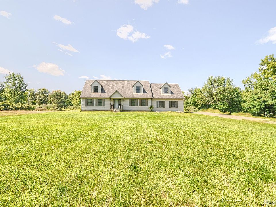 Situated on a secluded 4+ acre lot sits this 2 bedroom 2 bath Cape Cod home with endless potential! Both bedrooms are located on the first floor with the master suite featuring a walk-in closet and full attached bath. Spacious living room and kitchen area. Great views of the private backyard from the dining room door-wall. First floor laundry as well. Upstairs is an additional 700 square feet of unfinished space ready to be drywalled with the potential for 2 additional bedrooms and another full bath. There is plumbing ready to go on the second level for the third bath. The basement offers lots of additional space for storage or it could also be finished off! Two car attached garage. Located just north of I-69 and conveniently located within 15 minutes to Lapeer or Imlay City.