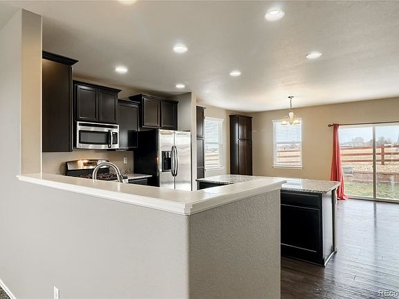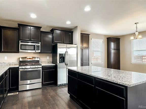 This beautiful home in desirable Buckley Ranch is just 1/2 block away from Second Creek Open Space, which has over 4 miles of trails. The home features a large kitchen and dining room with espresso cabinets, wide plank engineered wood flooring, granite counters, a large island with breakfast bar seating, stainless appliances including a 5-burner gas stove, and double pantries. An ideal floorplan regardless of if you like a formal or informal setup, with the kitchen open to the living room in the front and the family room on the side. Upstairs the large Primary Suite was upgraded with a double vanity, tile floors, a stunning tile shower surround, and a nice walk-in closet. Three more bedrooms and convenient laundry room complete the top floor. The full basement is unfinished and ready for your design with rough-in plumbing, a newer furnace and radon mitigation. This home backs to open space and has no bothersome neighbors behind you. Act fast, Buckley Ranch homes rarely come up for sale and when they do, they are gone quickly.