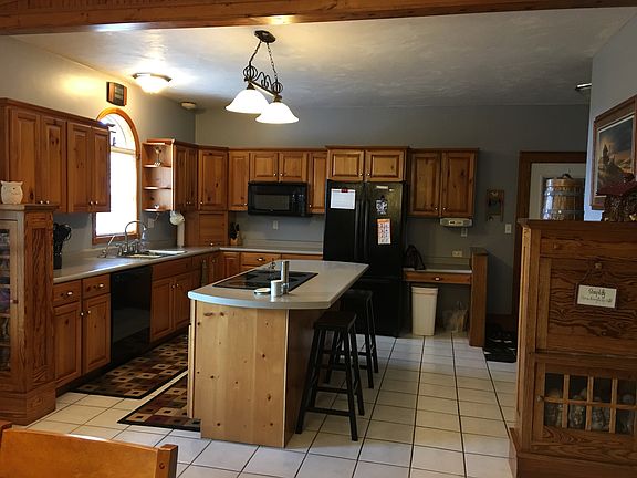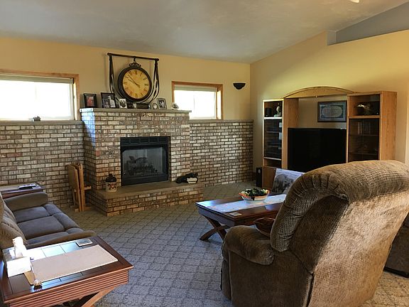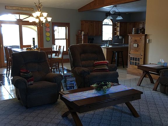 All on one level berm home. Home has 3 bedrooms, 2 full baths, and 2- 1/2 bath. Open concept living room, dining room and kitchen. Sun room with windows on three sides. There is a larger building that has a 950sq.ft. garage with work shop and storage area. It is heated and has a sink for clean up. In the same building but is separate, is a 700sq.ft. Man Cave. There is a half bath and is heated. Plenty of parking in the driveway for visitors. There are fruit trees in the back along with 2 acres of CRP. There is 1 acre of CRP in the front. Lots of wildlife around the property. Hot tub big enough for 7 people. Have to see this place to believe it. Beautiful view. All new ceiling fans, light fixtures, new bath fixtures, new geo thermo heat and air, and new roof. Also two gas fire places.