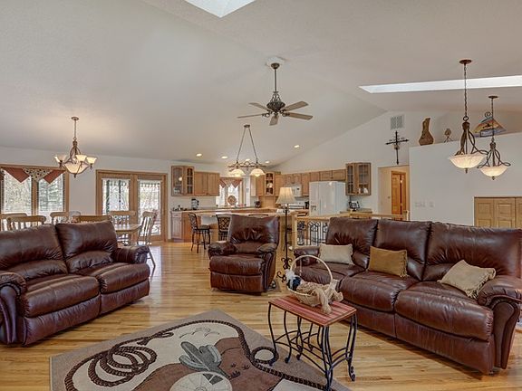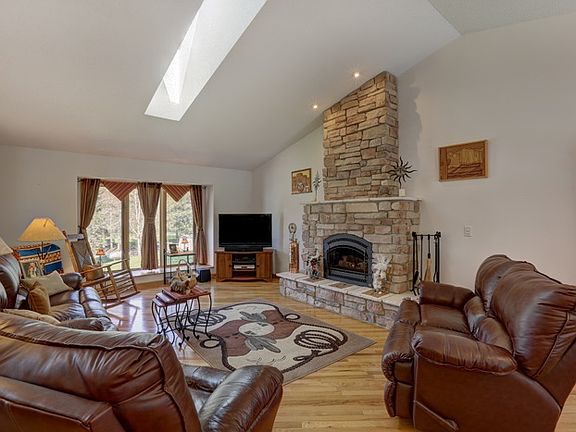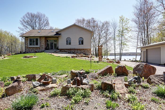 Like-new Raised Ranch home on Eau Pleine. Level lot with an open park-like setting and outstanding views! Home has a great floorplan with appealing attention to detail. Main level has bright windowed entrance with wood banister, opening into large living room with manufactured stone gas fireplace, cathedral ceilings, and dual skylights. The open concept continues with dining area with patio doors to huge deck (12x50) with canopy.Kitchen has hickory cabinetry, tiled countertops, center island and all appliances. There is a master's suite with cathedral ceilings and second set of doors to the deck (and views!). The walkout lower level has 1 bedroom accessesible with patio doors to the 8x50’ concret patio plus a stamped additional huge patio walking out to an 8’ Octagon fire pit all stamped concrete. An additional bedroom in basement both are carpeted with laundry room and 2 large storage rooms. 3/4" Hickory hardwood flooring or porcelain tile throughout. Attached is a 3-car garage and there is a detached 24x56 storage garage for the toys. Concrete floor all insulated and heated with separate lo tank. Dock included.
