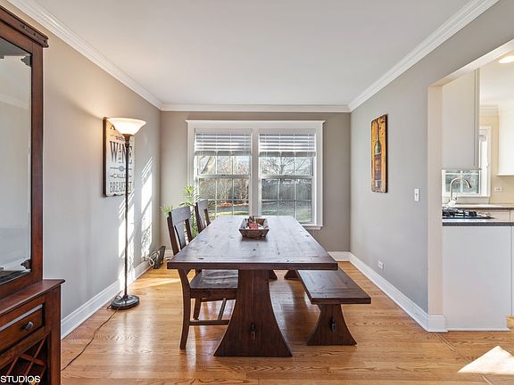 This stunning home welcomes you in through the gorgeous two story entry with decorator wainscoting and gleaming hardwood flooring that winds you through the entire first floor. You'll never want to leave the living room featuring soaring ceilings, amazing transom and floor to ceiling windows plus wall lighting sconces that is open to spacious and bright dining room with crown moulding. Love the heart of the home kitchen boasting recessed lighting, quality cabinets with glass panels and stylish accents and pulls, stainless appliances and plenty of solid surface counters overlooking the eating area. What a great family room perfect for cuddling up in front of the showcase brick fireplace or leading you through the triple French doors to your patio made of Chicago granite cobble pavers in the fenced yard. Retreat upstairs to your vaulted Master bedroom with wainscoting and private white bath with double sinks and separate double shower. Hallway loft area takes you to the three other bedrooms dripping with charm. Don't miss the fabulous rec room in the lower level complete with laminate flooring and surprise beverage nook, upgraded white trim, 6 panel doors, even a front porch! LOVE!