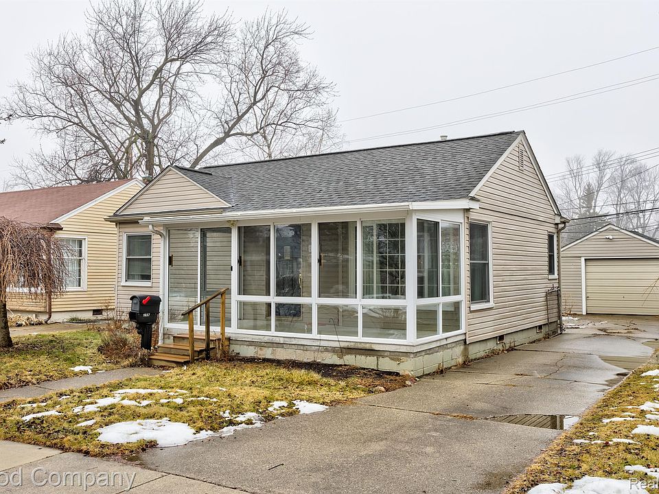 Adorable ranch in Ferndale offers a perfect blend of comfort, charm, and convenience just minutes from Downtown Ferndale. The home welcomes you with an enclosed front porch, ideal for relaxing or enjoying the neighborhood view. Inside, the large living room features hardwood floors, built-in shelving, and cove ceilings. The open layout connects the living area to a kitchen featuring a unique stone floor, ample cabinet storage, and plenty of counter space for cooking and entertaining. A handy laundry/mudroom at the back provides additional storage and functionality. Two generously sized bedrooms share a full bath down the hallway. Improvements include new windows and updated mechanics. The fenced backyard is perfect for outdoor living with a covered patio and detached garage. Welcome Home!