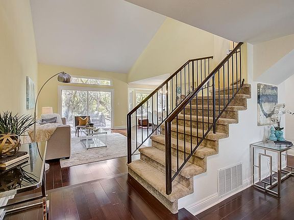 Located in the Belmont-Redwood Shores School District, this high tech Sugarloaf home with soaring living room ceilings and open floor plan is perfect for entertaining indoors and out. Sophisticated Brazilian mahogany floors. The spacious renovated eat-in kitchen with white shaker cabinets and quartz counters is perfectly equipped for the wine lover and gourmet chef with quick heating induction stove and huge wine refrigerator. Family room has a wood burning fireplace and is AT&T Fiber enabled. Master suite bathroom with double vanity, shower and bathtub and walk-in closet. Upstairs office loft has partial bay views. Laundry room with washer & dryer. EV (electric vehicle) Charger. Nest thermostat. Elfa built-in closets. Irrigation system. Quiet location looking out to the canyon and hearing the peaceful creek from the deck. Quick commute from Hwy 280 or 101. Move-in ready for summer BBQs.