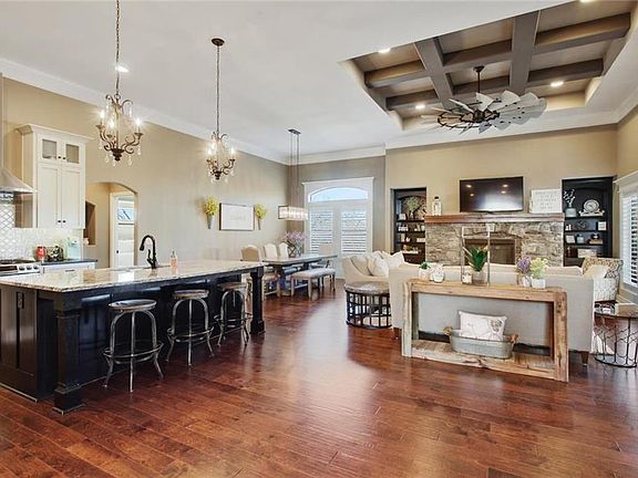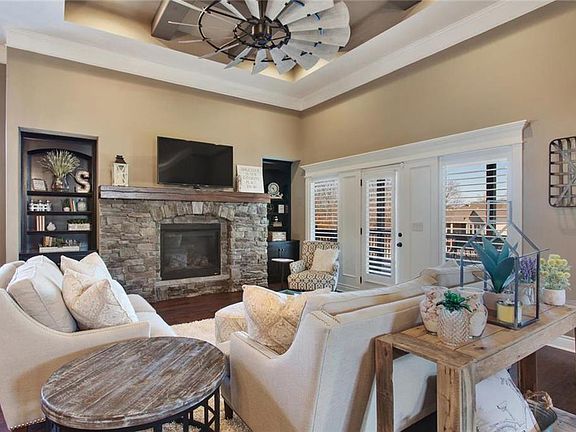 This Farmhouse Beauty is One-Of-A-Kind!Wide-open main level floorplan full of upgrades including gorgeous lighting, amazing granite,undercabinet lighting,AMAZING 12 foot ceilings throughout the main level,accent ceiling&stacked stone fireplace in great room.The finished lower level is MASSIVE&includes a projector w/projector screen,daylight windows,a FULL bar w/granite counters,2 large bedrooms w/egress windows&a fantastic full bath.Don't forget the amazing covered deck that overlooks trees&wildlife.Sprinklers too!