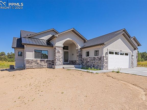 New construction. Never lived in. Discover our meticulously crafted 4-bedroom, 4-bathroom ranch-style home with attached RV garage. Positioned on an expansive 2.6-acre garden level lot for plenty of space between neighbors. The open floor plan integrates entertainment and living spaces. A commanding floor-to-ceiling stone fireplace serves as an architectural focal point, perfectly complemented by generously sized windows, beamed ceilings and an impressive 13-foot ceiling height, ensuring an abundance of natural light. The state-of-the-art kitchen is a culinary enthusiast's dream. Equipped with premium granite countertops, a spacious island for prep, and a well-appointed pantry, it is designed to cater to both functionality and aesthetics. Transition to the master suite to experience a realm of tranquility. This space boasts a spa-inspired bathroom, expansive walk-in closet, and a floating vanity. The garden level basement further accentuates the home's versatility, featuring a large family room, a dedicated space primed for game tables, and a large wet bar. Two additional suites, seamlessly connected by a Jack and Jill bathroom, ensure ample space for guests or family. Automotive aficionados will appreciate the spacious 4-car garage, with space to accommodate an RV. This tranquil location offers residents outdoor activities, spacious living, all while being in close proximity to shopping, restaurants and I-25.