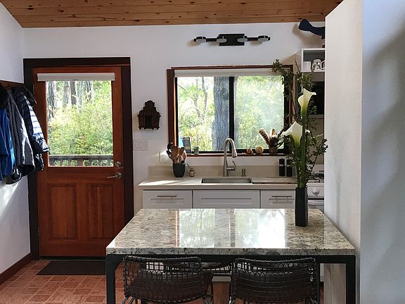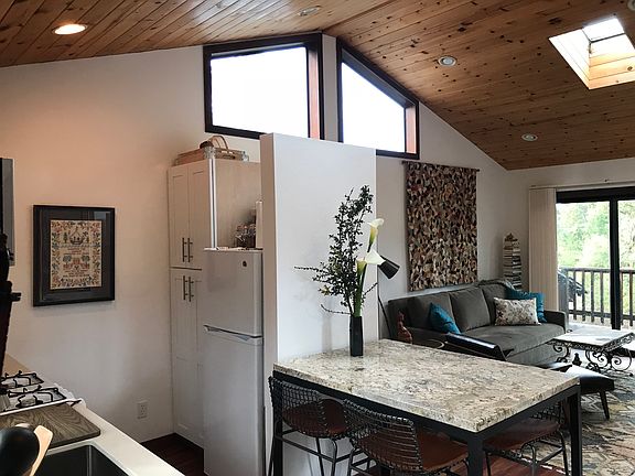 One-bedroom upper apartment over garage, with two decks and sunrise/sunset views, wood vaulted ceilings/skylights, full kitchen, propane heater, wood burning stove, full bath, loft space, laundry/storage facility on-site, window blinds, separate entrance. All white and bright with wood vinyl floors and plenty of storage. Onsite parking. Unfurnished. Attached to Owner occupied house and surround by lovely gardens.
