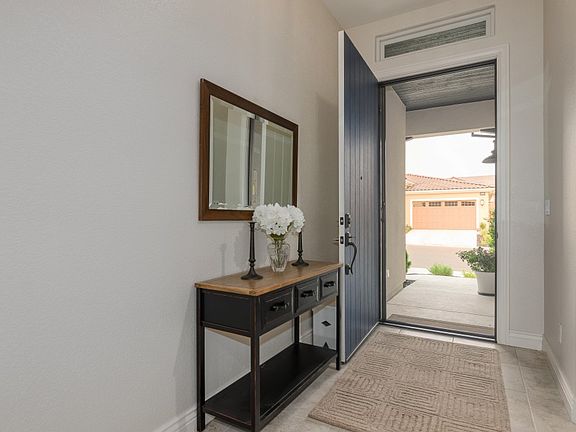 Stunning home in "Tuscany Village", the newest section of Trilogy in the Vineyards 55+ resort community. Enjoy all that the Trilogy lifestyle has to offer at "Club Los Meganos", only is a five minute walk from home. Bright and light, this open floor plan is perfect for entertaining with its expansive kitchen island, and a separate yet open dining area adjacent to the patio. Granite countertops, gleaming subway tiles, & extended upgraded cabinets in kitchen. Upgraded ceramic floor tiles, upgraded carpeting in bedrooms/den, French doors (glass) in den, zero-entry shower. The master suite has five windows, a luxurious bath & a gigantic walk-in closet. The backyard is wonderful for relaxing & entertaining with a covered patio, lovely landscaping and paver hardscape. There are even vineyard views! Tesla Solar System paid for by builder Shea Homes. Tankless water heater. GE appliances. Flat panel pre-wire and WAP for entertainment.