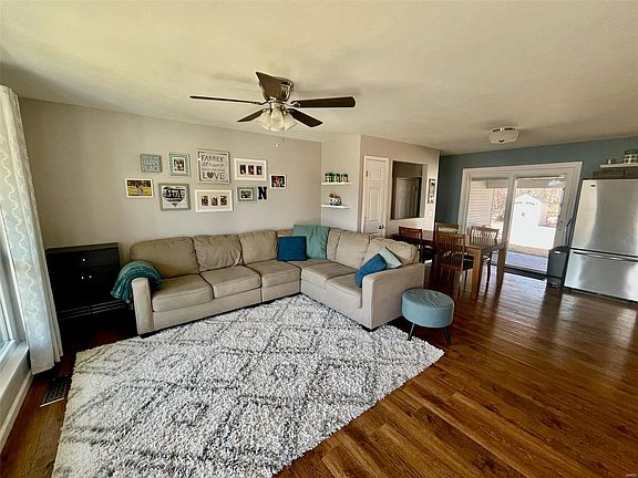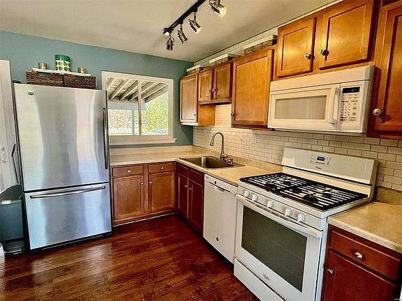 Get in soon and choose your roof color! Pristine 3-bed, 2-bath home near the park backs to a wooded lot. The family room has a ceiling fan and hardwood look flooring extending into the kitchen and hall. The kitchen and breakfast room feature maple cabinets, a subway tile backsplash, modern lighting, a pantry with organizers, and sliding doors to a covered patio. SS appliances; fridge, gas range, microwave, dishwasher, and disposal. Updated baths with ceramic tile, comfort-height vanities, and updated lighting, with master bath access from the master or hall. The partially finished lower level offers a sitting/play area, rec room, possible sleeping room/office, and a second full bath with a tile surround shower. Utility/laundry room includes washer & dryer! A 45’ tandem garage with almost 12' ceilings, fenced backyard, playset. Great location near HWYs, Rockwood Schools and commerce. Dry waterproofed basement. Backyard play haven with rubberized mulch. Upgrades too numerous to list.