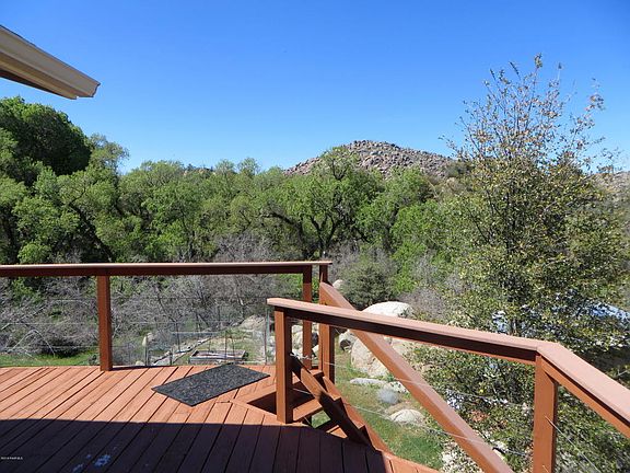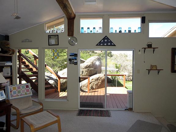 Situated among the boulders and loaded with charm, this updated 2 bedroom 1.5 bath home boasts a vaulted ceiling living room and a split master bedroom and half bath with private egress to deck, included hot tub and back yard. Extensive two level decking overlooks the lovely treed fenced yard, garden, and mountains. Access the second deck level and enter the family/game room with wet bar and included pool table and accessories. Sip a cold drink and enjoy the mountain view. You'll love the kitchen, brightened by skylights with travertine counters, plenty of cabinets, gas range, fridge and micro. The laundry with washer and gas dryer is located in garage/workshop. Double front gate opens to stone drive and front yard with room for small RV. Just a block from Hwy 89 shops and dining. 18x24