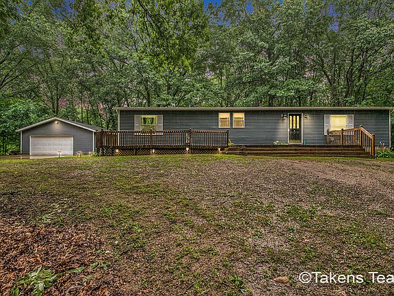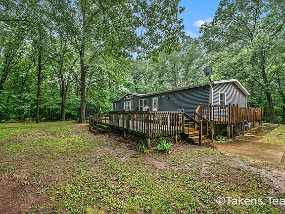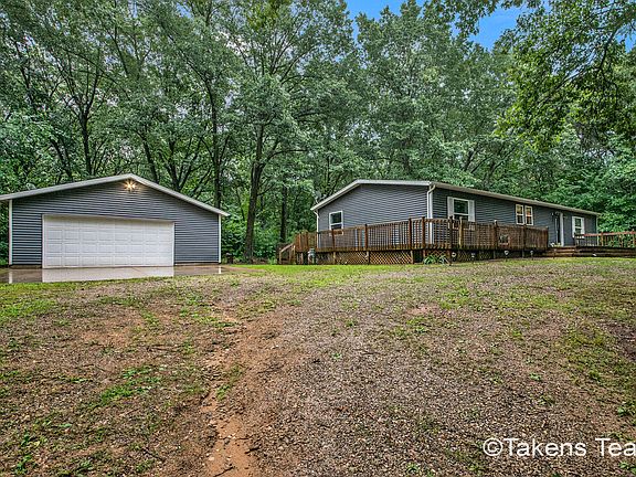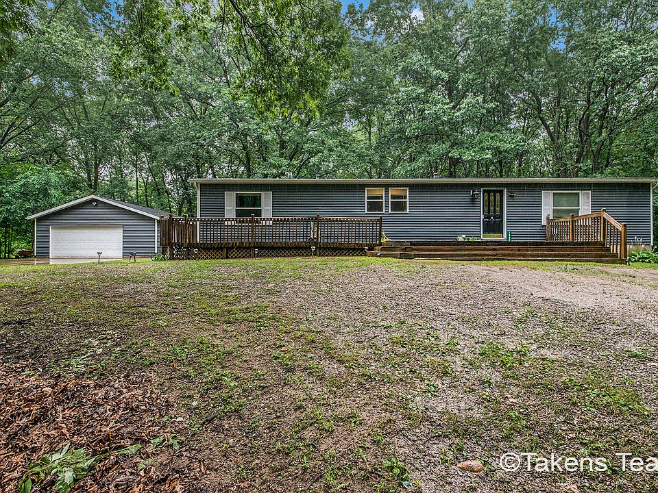 Large 4 bedrooms, 3 baths home on private wooded 1 acre with beautiful wrap around deck! Large 24 x 34 detached 2 1/2 car garage with own electrical. Home built in 1996 and positioned here by manufacturer in 2002. Walk into spacious foyer, open floor plan living room, dining room and kitchen. Kitchen has a large center island. Master bedroom has walk in closet and master bathroom. Main floor laundry room. 2 more bedrooms and full bath main level. Huge basement with 1 more bedroom and full bathroom. Large rec room. New furnace in 2020, Roof and Siding in 2018, New carpet in 2020,new dishwasher, newer toliets, area in front of garage is concrete, 6 panel solid wood doors, changed from Propane to gas, Built in humidifier,AC-heat pump, UV Sanitation light. Garden is tiled with fencing. Nice!