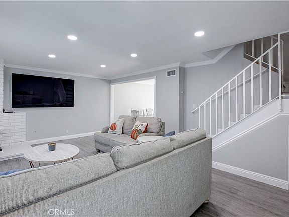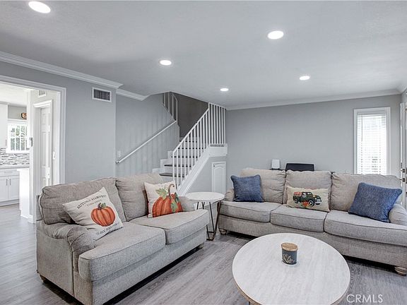 Open, bright, and inviting, end-unit townhome is located in the city of Tustin. Enjoy the private lifestyle with no one above you or below you, which makes this townhome all the more attractive! The living room has many windows, allowing abundant natural light to fill the space and creating a warm and inviting atmosphere with a welcoming fireplace. The recently remodeled kitchen features quartz countertops, a new sink faucet, white cabinetry, and stainless steel appliances, providing a sleek and modern look. Laminated wood flooring and baseboards can be found throughout the townhome. The house has also been freshly painted. The home offers plenty of storage space in the closet under the staircase. The detached garage has ample space for two cars and for storage with direct access to your private yard. The community offers residents and their guests a 2 pools and a clubhouse for special get-togethers. Excellent location with freeway access to the 22, 55, and 5 freeways! The entire complex exterior was recently painted. The perfect home to call your own!!