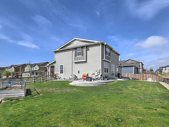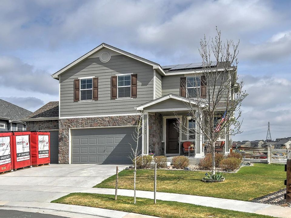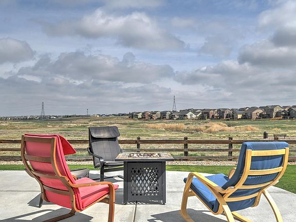 Located in Fronterra Village with-in walking distance to the elementary and middle school this move-in ready, like new two story home sits a large lot backing to Second Creek Open Space Park. This original owner home has TONS OF UPGRADES including a $20,000.00+ solar system (not a lease), brand new carpet 5/3/19, four (4) car garage and covered front porch. As you enter the home you'll love the open floor plan including the living room, family room with fireplace, dining room, open kitchen with stainless steel appliances, custom tile back splash and large kitchen island ready for entertaining. This home has three bedrooms, full bath with soaker tub and a large loft/play room on the second floor. The private master has views looking out over the trails and open space, master bath and large walk-in closet. Enjoy the amazing Colorado sunsets and mountain views from the back patio. Close to local shopping and DIA. Plenty of room for your toys and cars in the over sized FOUR CAR GARAGE.