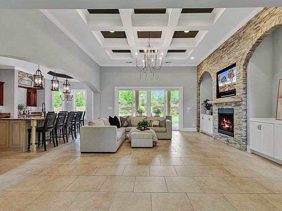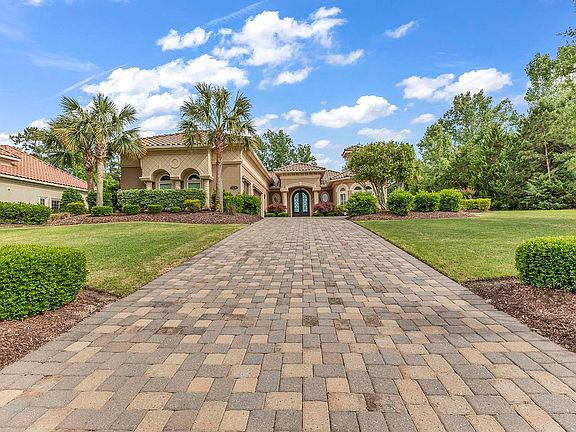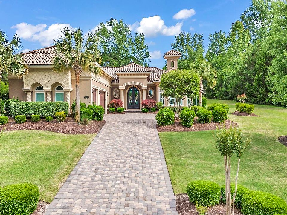 PRIVACY + 3 CAR GARAGE + EXTRA LARGE LOT! Welcome home to one of the most private residences in Grande Dunes. This rare move in ready mediterranean style 2933 sq ft home on an extra large lot is nestled in the ultra exclusive guard gated community of Grande Dunes Golf Village. Enter into the travertine tiled open floor plan and be greeted by the gorgeous coffered ceiling and stack stone fireplace wall, then be wowed by the stunning view of the beautifully landscaped, tree lined backyard and the very private lanai with additional fireplace and outdoor kitchen. Inside, a well appointed chef's dream kitchen is waiting to welcome you with stainless steel Bosch and Thermador appliances, granite countertops, newly updated tile backsplash, large center island and coffee bar alcove with new wine refrigerator and wet sink. This property boasts of new paint throughout and new LVP flooring in the bedrooms. The primary bathroom has been renovated with a new tile floor in the walk-in shower and begs you to relax in the large soaking tub. A full 3 car garage that has been kept immaculate with a newly epoxied floor has plenty of space for a golf cart or two! Enjoy the comfort of knowing the Ring doorbell, Sonos sound system and HTC security system has already been installed. This .074 acre property has plenty of space to add a private swimming pool as the green space to one side has ample room for equipment access. Come enjoy your luxury lifestyle with all that Grande Dunes has to offer! Membership to The Ocean Club with oceanfront pools is included! Live in close proximity to the Member's Club Golf Course, Grande Dunes Tennis Club and dock your boat at a slip in Grande Dunes deep water Marina!