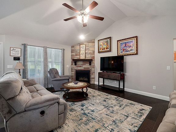 Welcome to your dream home! This 4 bedroom, 2 bath home boasts a 3 car garage. Situated in a prime location, enjoy easy access to amenities and schools. Entertain guests in style or early morning coffee on the beautiful screened-in back porch. Built in 2020, it offers the perfect amount of contemporary design and functionality! Step inside to discover the luxury of engineered hardwood floors, a cozy gas fireplace, vaulted ceiling, granite counter tops, walk-in pantry, gas stove, and security system. This home is equipped with irrigation to maintain a beautiful yard for excellent curb appeal. F5 Storm Shelter conveys with the home!
