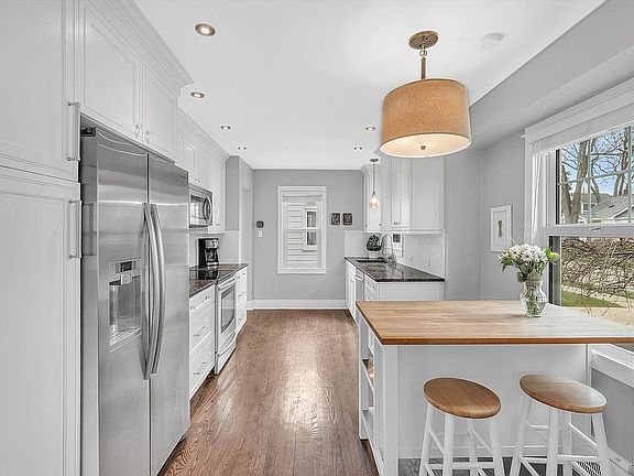 Major curb appeal on this beautifully updated 3 bedroom 2 bath 1940's Berkley bungalow. Charming craftsman style front door with stained glass leads to an oversize living room and spectacular open concept eat-in kitchen that features custom Lafata cabinets, subway tile, granite counters, high end appliances and abundant natural light. Two bedrooms downstairs, one with back entry to small porch that overlooks a lush backyard and 2 car garage. Incredible master suite upstairs features a gorgeous master bath with double vanity, Euro glass shower and walk-in closet. Finished lower level makes for a perfect play room or office, with bonus wet bar for entertaining. Truly among the nicest renovations I have seen. Welcome home!