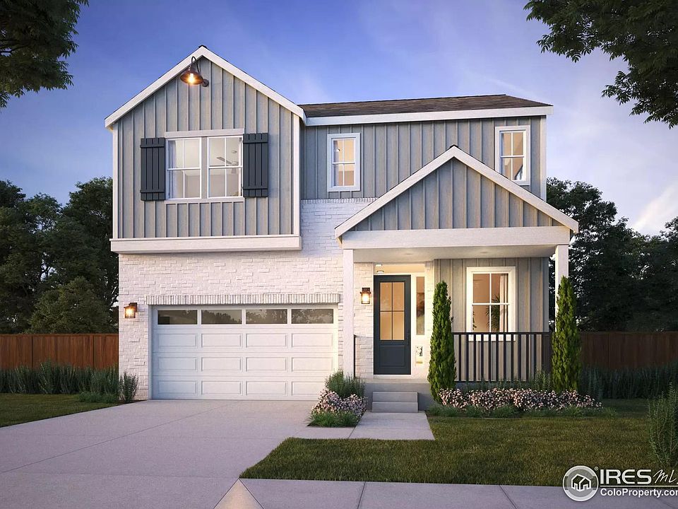 Plan 5 Farmhouse in Festival at RainDance by Trumark Homes is a contemporary two-story home offering 2,268 sqft of living space with 3 bedrooms and 2.5 baths. The home features an inviting porch with an office and powder room off the front of the home. Beyond the entrance hall and foyer is the gourmet kitchen featuring a spacious walk-in pantry, ample storage, and a center preparation island which overlooks the dining and great rooms. The kitchen includes Nantucket Style cabinetry with Dusk stain, Frost White Quartz countertops with tile backsplash, stainless steel appliance package with 5-burner gas cooktop, convection oven, built-in microwave, and dishwasher. This room connects to the large Colorado outdoor room for easy entertaining. Your unfinished basement is ready for you to customize with rough-in for wet bar, as well as a fourth bedroom and bathroom.Upstairs you'll find a multi-functional teen room, two secondary bedrooms, and laundry room with an optional sink. The primary suite offers a luxurious, spa-like bathroom with dual sinks, walk-in shower, and an expansive walk-in closet. This home includes an oversized 2-car garage, perfect for parking your golf-cart or just extra space. The home comes with water-resistant laminate flooring in the entry and kitchen, luxurious carpet in bedrooms, spacious 10-foot ceilings on the main floor and 9' on the upper floor and basement, tankless water heater, and AC, oversized garage with insulated steel garage door, and much more! Neighborhood amenities of walking trails, orchards, non-potable water and trash, are included in your metro district fees. Membership to the Raindance pool is optional and currently $480/year; there are also other membership options combining amenities in Raindance and nearby Water Valley - "WaterDance"!