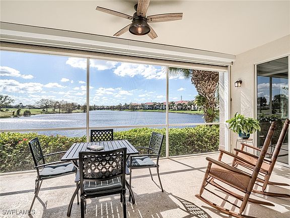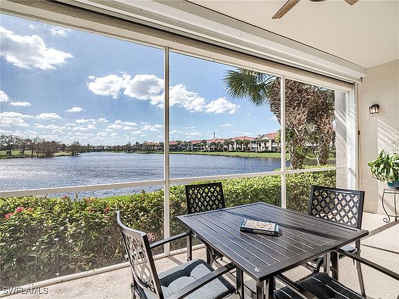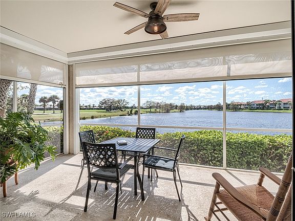 Perhaps the most updated condo now available with a fabulous full south lake view. This 2+den, 2-car garage condo with the long south view of the lake and the 2nd Crown Colony fairway on the left is one of the best ground floor lakefront condos. The kitchen countertops and island (with new cabinetry) were updated with white Quartz. Except for the tile in the kitchen and baths, all flooring has been updated with wood laminate. Ceiling fans and window coverings are also updated throughout. The A/C was new in 2020, the water heater new in late 2024, and the Samsung fridge in 2020. For storm protection, the lanai has StormSmart remote fabric roll-down shutters that let the light in and keep the wind out. The low quarterly dues include building and flood insurance, landscape, and water, plus provides 24x7 attended gated access, a community pool, hot tub, 4 Har-Tru tennis courts, and a well-equipped fitness center open 24x7 plus Comcast fiber-optic cable and the Xfinity X1 platform with up to 4 TV/DVR boxes, and high-speed Wi-Fi Internet, all part of the dues. Membership at The Golf Club at Crown Colony is optional. This Club was chosen for the 2022 LPGA $1.5M Drive-On Championship, hosting the world's top women golfers.