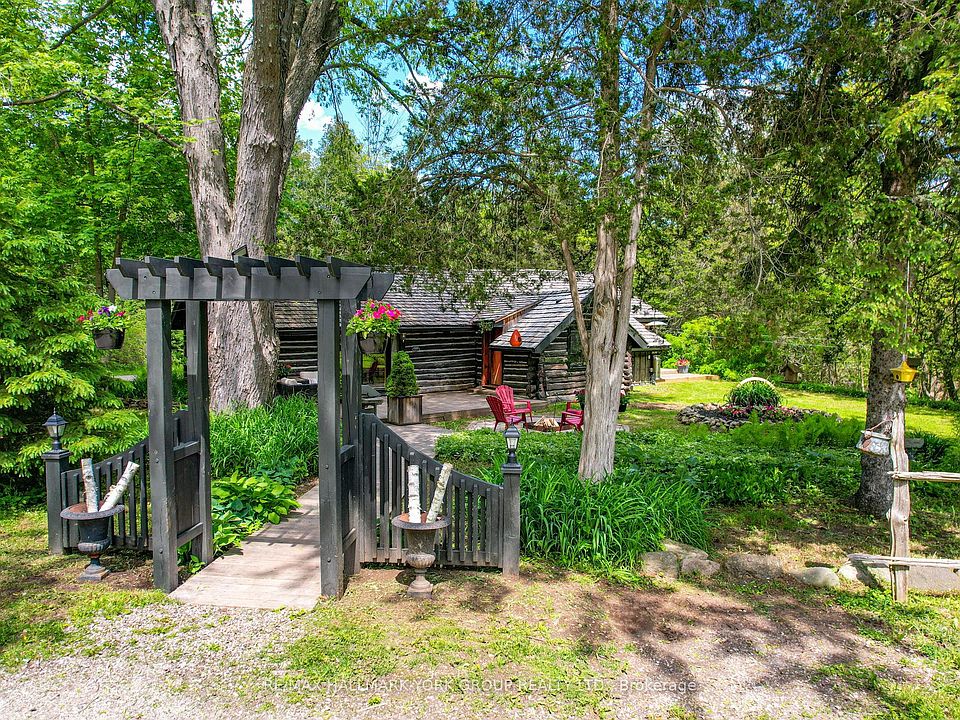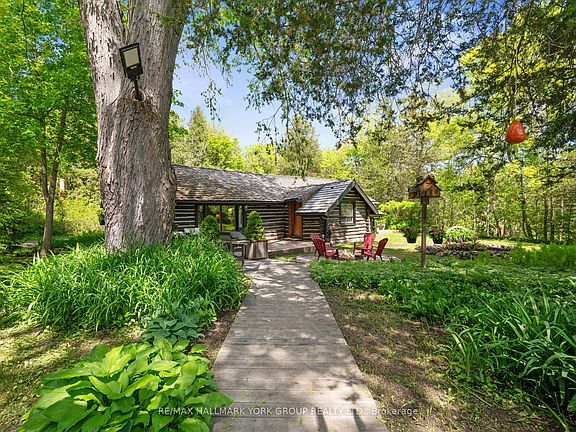 Step into a piece of Caledon's history with this exquisitely restored log home originally built as a ski lodge and now thoughtfully updated with modern finishes on 2.78 acres of serene, private land with a picturesque pond. A long, winding driveway leads you through a peaceful treed setting to this one-of-a-kind home. Ideal for entertaining, the home features nearly 2500 sq ft of living space. Inside, a marble-tiled foyer with decorative mosaic inlay sets the tone for the refined details throughout. Pine floors run across the main level, leading to a vaulted living room with exposed beams and a striking stone wood-burning fireplace perfect for cozy evenings. The open-concept dining area flows seamlessly into the kitchen, which features granite countertops, stainless-steel appliances, ample cupboard space, and a cleverly hidden pantry. The spacious primary bedroom is a true retreat, offering a walk-out to the private deck overlooking the pond, custom built-in cabinetry & closet space, & a luxurious 4-piece ensuite with heated floors. Two additional bedrooms provide peaceful views, generous closets, and access to a beautifully updated 3-piece bathroom with a glass shower, marble tiles, custom vanity, & heated floors. Downstairs, the fully finished basement adds incredible versatility with a large rec room centered around a sleek gas fireplace framed by a custom black metal mantle. The space is further enhanced by custom built-in cabinetry, pot lights, & modern finishes. A dedicated office & spacious bonus room perfect as a studio, gym, or playroom complete the lower level & the exterior boasts timeless log construction with cedar shingles. Just minutes from local amenities and highway access, this truly special home blends historic charm with contemporary comfort, offering the perfect balance of privacy and community where rustic warmth meets refined living.