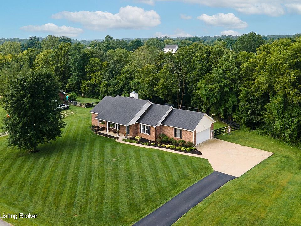 Here's the one you've been looking for! You'll fall in love w/this very spacious & updated all-brick ranch home w/a huge finished basement & sitting on over an acre of land that is partially wooded & on a quiet dead-end road. As you pull in notice the newly paved driveway leading up to the side entry attached garage. There is a big front yard w/lovely landscaping & fresh mulch as you make your way up to the large covered front porch. Upon entry you will find GORGEOUS hardwood floors, the cozy wood burning fireplace & vaulted ceilings in the great room. The dining area is open to the kitchen & the great room. This home features a spit floor plan w/a very spacious primary suite to one side & the other 2 bedrooms w/a full bath on the other side of the great room. The kitchen comes complete with all stainless appliances, beautiful updated cabinets , large island w/shiplap design & gorgeous updated quartzite countertops! The primary bathroom features a large walk-in closet, tub/shower, updated luxury vinyl flooring, & updated double vanity. The other 2 bedrooms upstairs feature tray ceilings & the full bathroom has tub/shower, an updated vanity & updated tile flooring. This home has an amazing basement! 1645 sq. ft. finished! Featuring a huge open family room (with lots of storage in the closets behind closed doors) two other large rooms w/closets (used as 4th & 5th bedrooms), a 3rd full bath, & a separate space for gym, office, game room, or whatever you'd like it to be. There are a couple of small unfinished rooms for the mechanicals. The kitchen walks out to the deck w/ a beautiful wooded view. The fully fenced back yard is perfect for kids and/or pets and for entertaining your family or friends! There is a 10X8 shed for extra storage. Enjoy peaceful country living just minutes from the city. Come see this beauty today!