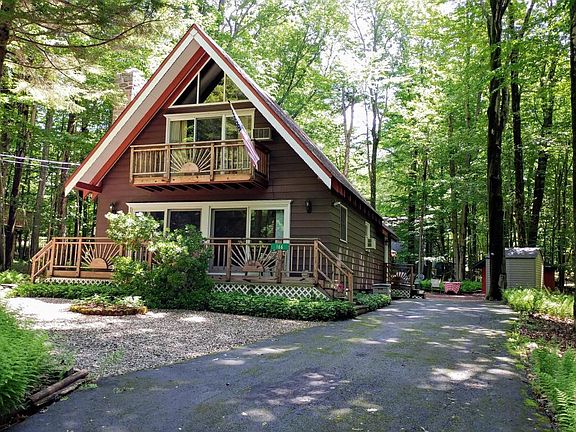 Very well cared for Cute and cozy but also very roomy Classic Pocono Chalet in Locust Lake Village. This home boast 2 nice size bedrooms with hardwood floors. Large Living room with Stone Fireplace, Kitchen and Dining area with Pergo flooring overlooking the large family room. This home has 3 sources of heat, Oil hot water Baseboard,Electric Baseboard & Norwegian Wood stove in the family room. 1 Air conditioner in master and 1 in the Dining area. Large Lot with a great entertaining area in the back and plenty of space on the right side for any additions you are considering. Paved driveway which can hold 6+ plus cars. Two storage sheds for all your tools and toys. Quads and golf carts are permitted.So put this on the top of your list to see.This home comes furnished.