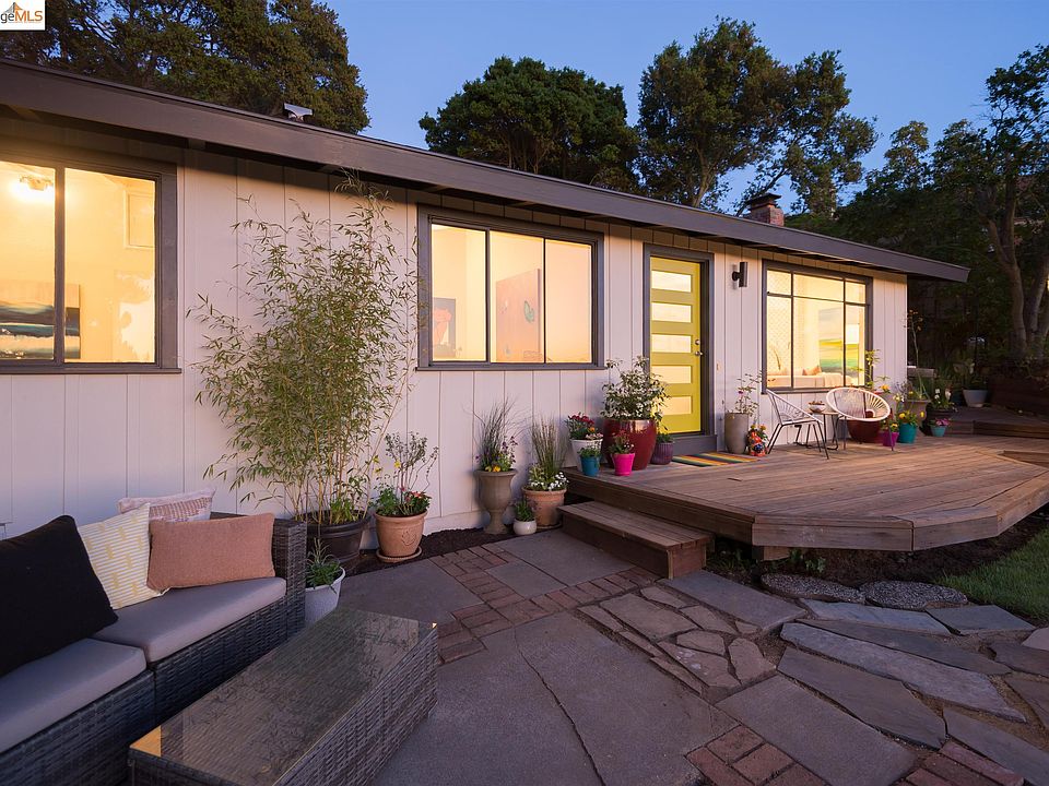 Mid-Century Modern inspired home with views in the coveted Glen Highlands area of Montclair! This 3 bedroom, 2.5 bath home is a one level sanctuary, overlooking the western slope of the Oakland hills with filtered vistas of the Bay and San Francisco cityscape perched on ¼ acre of land. Upon entering this beautifully updated gem, one is greeted by a fireplace, open beam ceilings and gorgeous hardwood floors. The home is flooded with natural light, the flow is effortless between the great room, bedrooms, and outdoor spaces. The kitchen has a beautiful tile backsplash, quartz countertops, new sink and many other elegant touches. There are 3 cozy bedrooms; a primary with en-suite bath that has a new vanity, lighting and wallpaper. Another full bath shared by 2 bedrooms, has been updated with all new tiling. Adjacent to the kitchen is the conveniently located ½ bath and laundry room. Decks wrap around both the front and side of the home, surrounded by mature trees — perfect for outdoor dining and lounging. Dinner parties will spill outside, where one can relax while watching the glorious sunsets. Please be thoughtful of locals and emergency vehicles when parking.