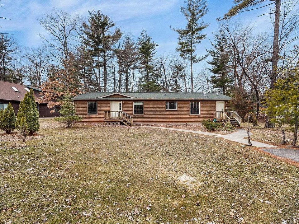 Log cabin living! This spacious 3BR with split bedrooms, 2BA home located in the Spring Brook Resort has a large open concept living room with stone gas fireplace and spacious dining area with large kitchen island. Primary suite has whirlpool bath, and a deck leads to the back yard. Purchase additional resort amenities for activities, including the resort's golf course and swimming pool. Excellent primary residence or vacation home. Located near popular Wisconsin Dells attractions. Don't miss this rare find.