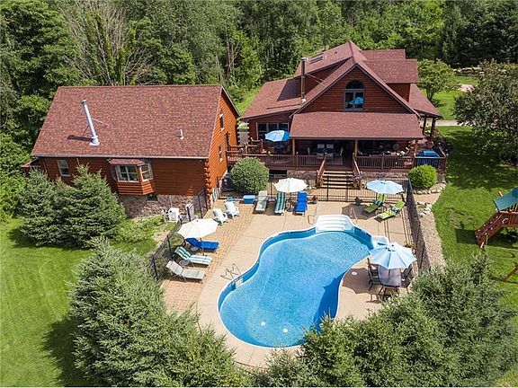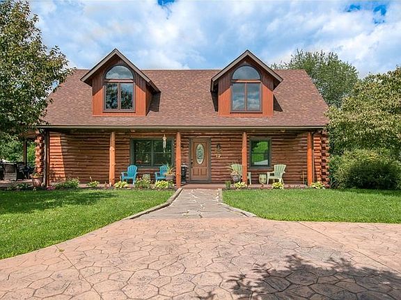 Immaculate log home on 13 acres offers the best of country living, yet is close to airport, shopping, and highways. Open first floor with an abundance of natural lighting. Living room has vaulted ceiling, wood burner, and french doors to deck. Upgraded kit features granite counters, SS appliances, and a large island with wine fridge and prep sink. Huge dining room perfect for entertaining! Two bedrooms on the first floor and full bath with dual vanity, tiled shower, ceramic flooring, large linen closet. Upper floor features master suite w spa bath, and a flexible loft space to suit buyers needs. Lower level offers a finished gameroom, fully equipped exercise room, full bath, storage area, and WO to stamped concrete patio. Incredible outdoor space w/welcoming front porch, large wrap around deck, heated in ground swimming pool, and private partially wooded views. Fully equipped guest house. This is a unique property with so much to offer and is impeccably appointed and well maintained.