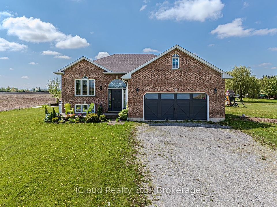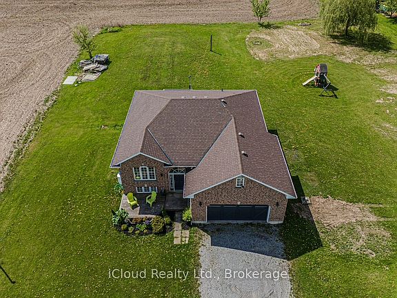 This Fresh and beautiful raised bungalow is nestled in Haldimand County offers comfort, space and countryside charm. Built in 2002 and set on a sprawling 1.14 acre lot surrounded by farm fields. This carpet free 2 plus 1 bedroom 2 bath home features over 2500 sq. ft. living space across two levels. Abundance of natural light throughout starting at the welcoming foyer leading up to the main floor with an inviting living / dining room combo flowing seamlessly into a well appointed eat in kitchen with S/S appliances, lots of cupboard space and access to backyard patio through double sliding doors. The spacious primary bedroom has a huge walk-in closet and access to a modern four piece bathroom with separate stand up shower and deep tub for those relaxing end of the day quiet times. 2nd bedroom has a double wide closet and relaxing views. The finished lower level is ideal for entertaining with a large family room boasting a custom bar and bright oversized windows, an additional large third bedroom with unique ceiling , convenient bathroom with stand up shower, storage room and utility room. The double wide lot is perfect to build a shop, outdoor camping under the stars or create your very own garden... endless opportunities to personalize. This property is complete with a 1.5 garage featuring 11.5 foot ceilings perfect for hobbyists or extra storage P/G Furnace 2018, Roof 2018, 200 AMP Hydro, P/G water heater, Water Purification, 3000g Cistern ,Freshly painted 2024, all new flooring 2024 and light fixtures 2024. Location is country but also close to several hot spots 30 Min to Hamilton, Brantford and 403. Easy access to Waterford, downtown Hagersville, Jarvis and Simcoe!