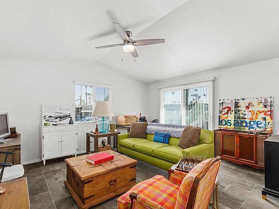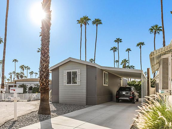 Discover easy living in this like-new, 1-bedroom, 1-bath manufactured home built in 2021, located in the over-55 gated community of Royal Palms in Cathedral City. With 713 sq. ft. of living space, this home features newer stainless-steel appliances, a gas range, and a full-size stackable washer and dryer for your convenience. Enjoy the contemporary tile flooring and stay comfortable with ceiling fans in the living room and bedroom. Additional perks include a separate storage shed and covered carport parking. The community offers a heated pool, spa, fitness center, pickleball, putting green, and a clubhouse with billiards, ping pong, and a card room. Plus, you'll never be short on social activities in this vibrant community.