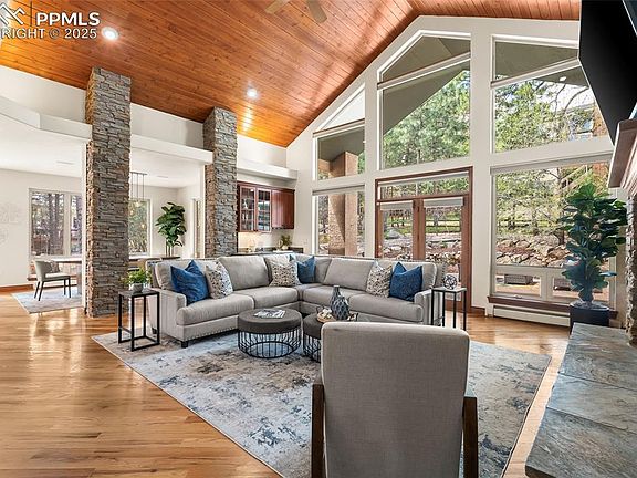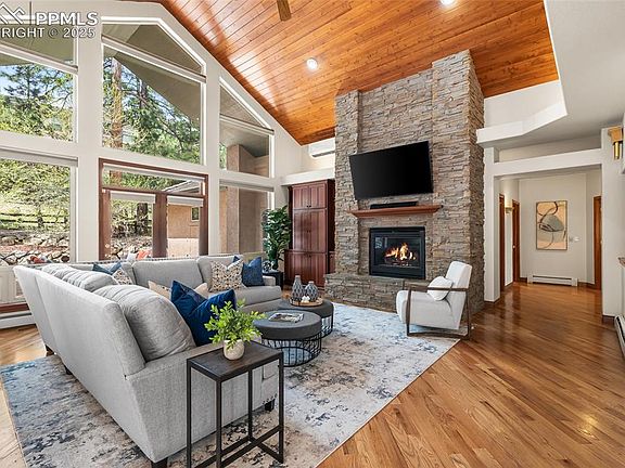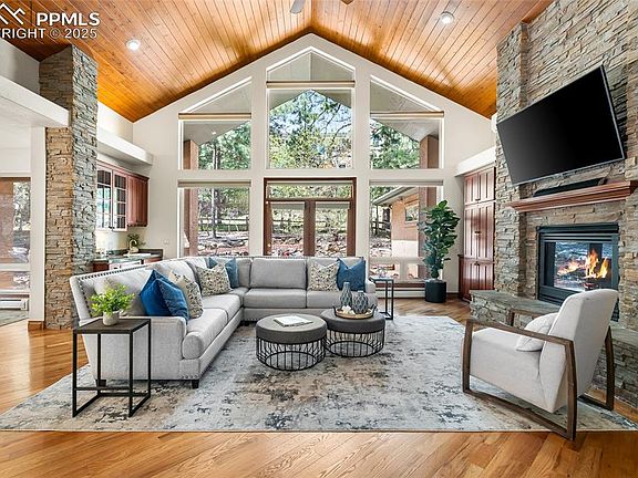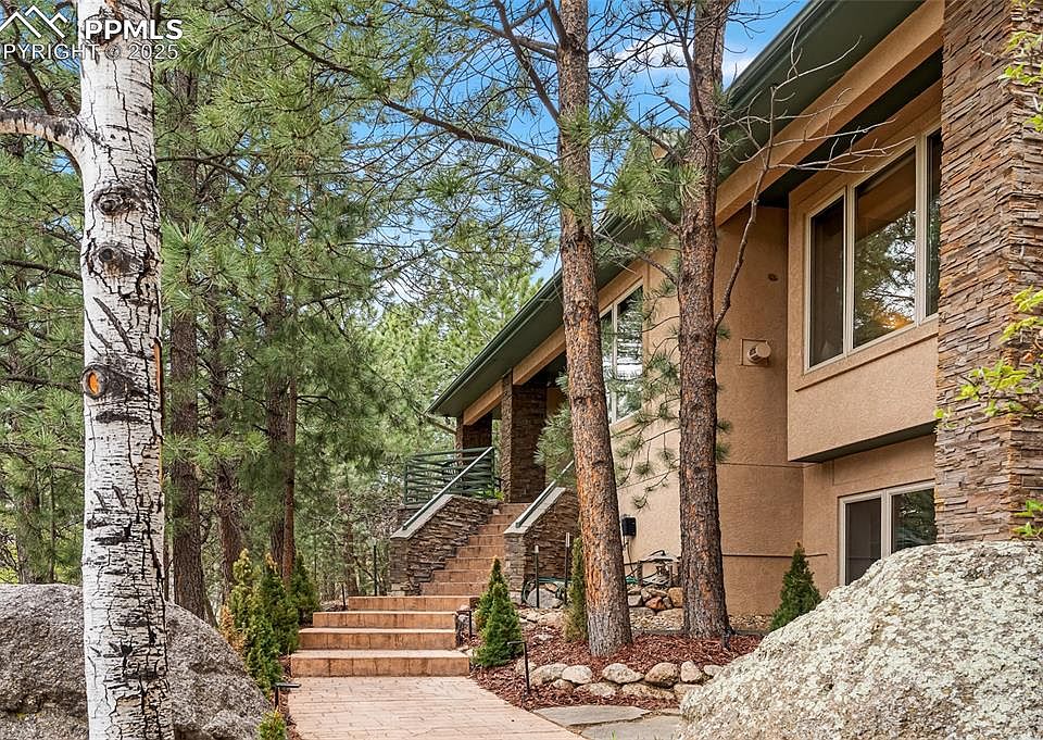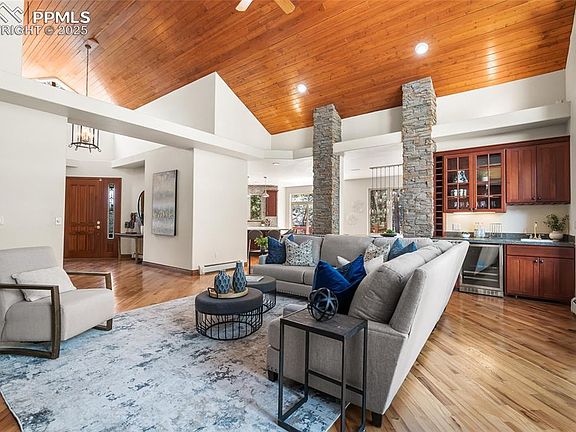 Nestled at the end of a tranquil cul-de-sac on a beautiful half-acre in the prestigious Broadmoor Bluffs Park neighborhood, this exquisite residence offers privacy, serene surroundings, and access to top-ranked D12 schools. At its heart is a grand living room with refinished red oak floors, vaulted ceilings, floor-to-ceiling windows, built-ins, a wet bar with wine refrigerator, surround sound wiring & doors opening to a private fenced patio surrounded by mature trees & visiting wildlife. Designed for multigenerational living, the home features two luxurious kitchens. The main kitchen boasts quartz countertops, 6-burner THOR gas cooktop with grill, double ovens, drawer microwave, stainless refrigerator & an oversized island with pendant lighting. A second patio off the kitchen is ideal for outdoor dining. The formal dining room offers an elegant space for entertaining. The primary suite is a spacious retreat with tranquil views, a five-piece bathroom & a large walk-in closet with custom built-ins. A main-level office with built-ins, a remodeled powder room, a large laundry room & three-car garage complete the main floor. The light-filled garden-level basement offers a second full kitchen with quartz countertops, three bedrooms — two connected by a Jack-&-Jill bath & a third with access to a full guest bath — a huge storage room & luxury vinyl flooring. Extensive upgrades include full replacement of polybutylene piping, a new boiler & hot water heater, air conditioning units, active radon mitigation, new recessed lighting, a LeafFilter gutter system. This home also offers easy access to I-25, shopping, dining, entertainment, military bases, the Cheyenne Mountain & Broadmoor Resorts, the Cheyenne Mountain Zoo & the future Fishers Canyon Park area, part of a planned 26-mile trail system connecting Colorado Springs’ iconic parks & open spaces. A rare blend of natural beauty, luxury & convenience, this Broadmoor Bluffs residence defines Colorado living at its finest.