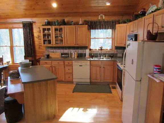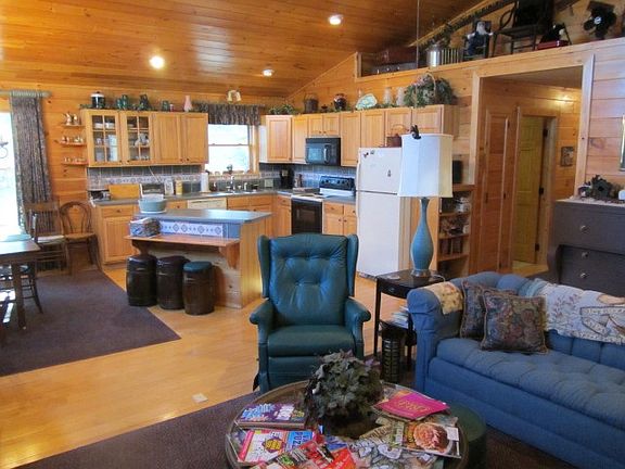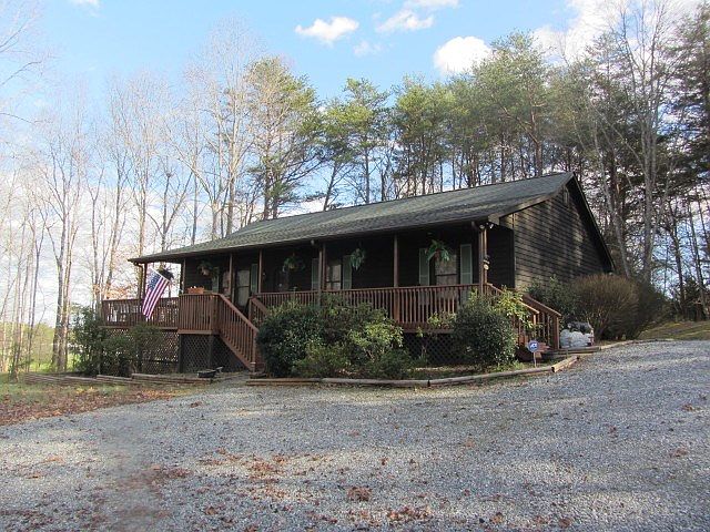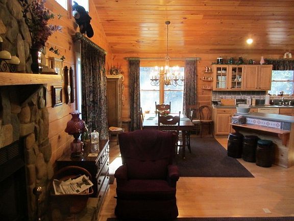 Extremely nice log cabin built in 2001 and used exclusively as a second home. This house has a big front porch and side porch for all the rocking chairs you need! Main entry room has a high beautiful wood ceiling with the main living area, dining area and kitchen all in this area. Kitchen has lightly stained cabinets, laminate counters, an island and a double stainless sink. There is a small laundry room in the hallway that also has some pantry space. There are three average sized bedrooms and two full baths down the hallway. There is fireplace with gas logs in the family room also. Although house is mostly on a crawl space there is a small unfinished room with a 36 inch door for storage under the house. The lot is 2 acres and is mostly wooded except for the house area and a small yard. There are winter mountains view from the side porch. Price does NOT include furnishing, but owner would prefer to sale the property fully furnished. This is a great house.