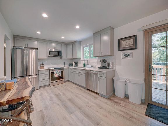 Lake Wallenpaupack Lakefront - 6 bedrooms, 2 1/2 baths! Home offers a flowing floor plan with updated kitchen, dining area, living room, and finished, walk-out lower level with family room with fireplace and more! Spacious lakeside deck, beautiful level yard next to the water, steps to the dock & more! Paved driveway, attached one car garage and great location!, Beds Description: 2+Bed1st, Beds Description: 2+BED 2nd, Beds Description: 1BedLL, Baths: 1 Bath Level 1, Baths: 1 Bath Level 2, Baths: 1/2 Bath Lev L, Eating Area: Dining Area, Eating Area: Modern KT
