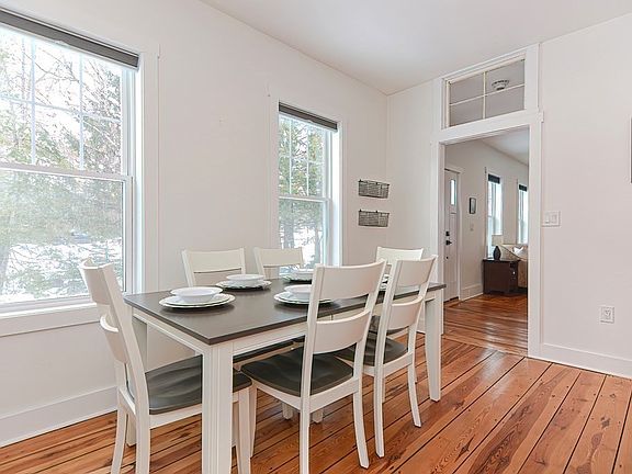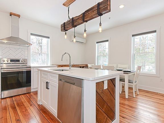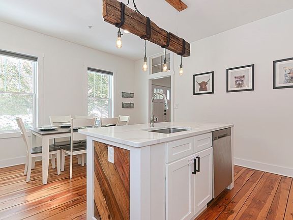 3 year young unit at Poor Farm Condos! Very exquisitely designed. 3 bed, 1.5 bath unit w/ 1 car garage & 1 deeded parking space. 9' ceilings & recessed lighting throughout! Sunny & bright living room w/ stunning wide plank chestnut flooring leads into Gorgeous kitchen w/ large island, stainless appliances, quartz counter tops. There is also a reclaimed wood breakfast bar featuring a counter top that converts to bench seating. Office space located off the kitchen. Half bath w/ reclaimed wood vanity & the utility room complete the 1st flr. Second floor offers primary bedroom also w/ wide plank flooring and a walk in closet with sliding barn door. Two additional bedrooms have plank floors and great closet space. A full bath boasts a beautiful tiled shower and double vanity made out of reclaimed wood along with a laundry area. Outdoor space features a brick patio with shared and private areas, granite posts, stone wall, post and rail fence and there is even a fenced in dog park!