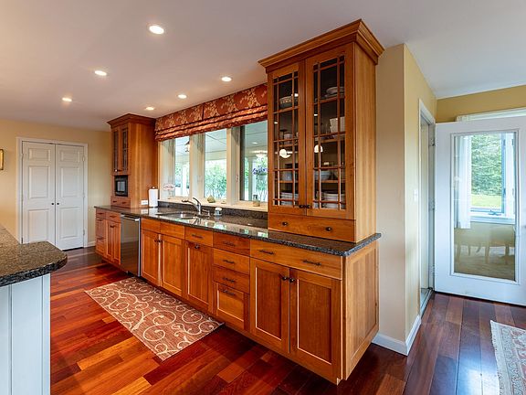Beautiful and well maintained 3 + bedroom home with big wrap around deck to enjoy the view to Vermont. Over sized attached garage opens to the mudroom, many closets, and laundry. A more formal entry opens from the covered deck. The kitchen has plenty of cabinets, a big granite topped island and a door to the deck for easy access to your outdoor grill. The living / dining is warm and welcoming. Off the living room, there are two offices, which have the possibility of being a ground floor bedroom with 3/4 bath. Upstairs are three bedrooms, including a very large primary that has 2 walk-in closets plus an ensuite bath. The walk out basement is partially finished with all kinds of possibilities for overflow guest space, family or exercise room or craft room. A lovely back yard for more gardens or play space on 4.44 acres.