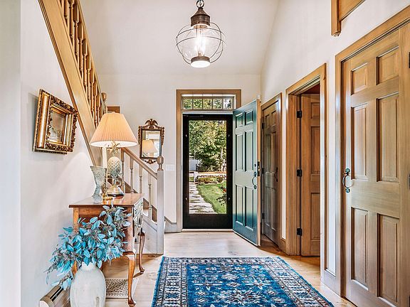 This beautifully expanded Cape-style home, designed by Royal Barry Wills, blends timeless charm with modern amenities, high energy efficiency, and classic design. The property boasts striking curb appeal, with elegant stone walls and native stone walkways leading to the entrance. Step inside where spacious expansive living spaces feature the highest quality finishes. Wide windows embrace  breathtaking views.  A brand-new custom country kitchen features state-of-the-art appliances, an abundance of custom storage even a hidden pantry/coffee bar. The adjacent screen porch will become your sanctuary & an ideal place to entertain. The gracious living room, and library, each feature quality built-ins and wood-burning fireplaces. The primary suite is located on the main level. Upstairs, two bedrooms share an en-suite bath.  The lower level provides a fourth bedroom option or an area ideal for a home business.  There are options for work-out space, a craft room, full bath & workshop. A professionally designed landscape includes a  stunning outdoor living & dining area complete with a wood burning fireplace, native stone terracing, outdoor grill area, abundant gardens, winding granite steps through lush gardens even a secret reading spot! Solar panels are discretely located & designed to move with the sun. Situated on 10 private  acres, this home is just a short walk to the shops & restaurants in the  New London village!
