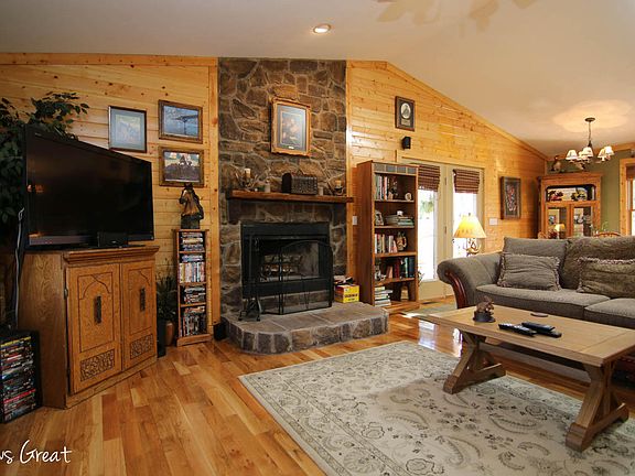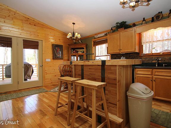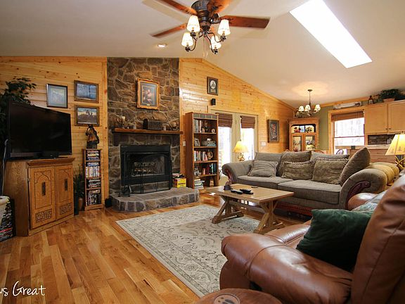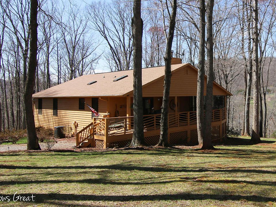 Wooded 5 acres, 3 BR 3 BA home w/look & feel of your own private lodge. Wrap around porch, 2 sides,part screened,mountain views, amazing breezes. Shiplap accent walls, floor to ceiling stone on wood burning fireplace. Soaring ceilings throughout. New HW, carpet BR's, granite kitchen counter. Master w/balcony Large family room. Hard wired for generator. 2 car gar. Detached workshop/shed. Warranty!