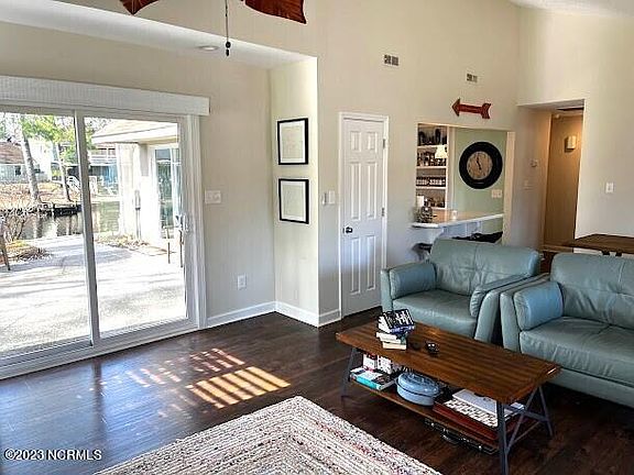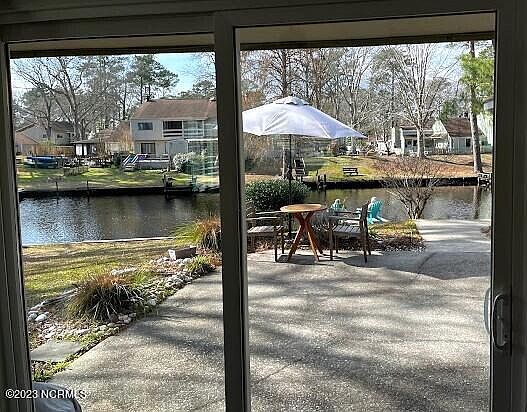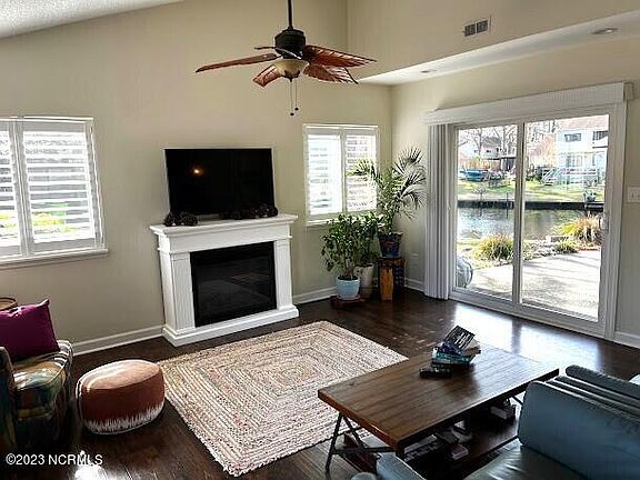 Ready for easy waterfront living? This turnkey two bedroom two full bath waterfront end unit in River Bend is where you need to be! Full of natural light, beautifully bright and spacious, your first view when you step inside is of the water. An open living room and dining room area complete with plantation style blinds, modern lighting, electric fireplace, and beautiful wood faced laminate flooring give a cozy vibe to this home. The kitchen has stainless steel appliances, built in open shelving, plenty of cabinetry and countertop space with under the counter barstool seating. Heading off the hallway you'll find a nice sized bedroom with built in shelving, a large closet, and a small seating area for reading, crafting or as an office space. A full bath is in the hallway and a separate closet is where you will find the washer and dryer which, by the way, convey with the home. Further down the hall you will find the primary bedroom with its own private ensuite, two closets: one walk in, one stand in and an amazing view of the water. Step outside through the primary's sliding glass door onto your patio and further enjoy the views of the garden and water. Stroll a bit further to your own private waterfront deck where you can while away hours enjoying nature, fishing, skywatching and stargazing. If you're looking for a space to be with peaceful views and minimal upkeep, then welcome home! River Bend offers many amenities such as kayak launches, golfing, walking trails, a dog park and it's close to shopping, restaurants and Downtown New Bern.