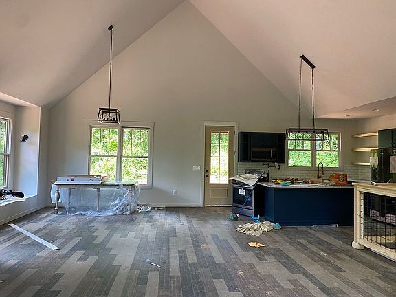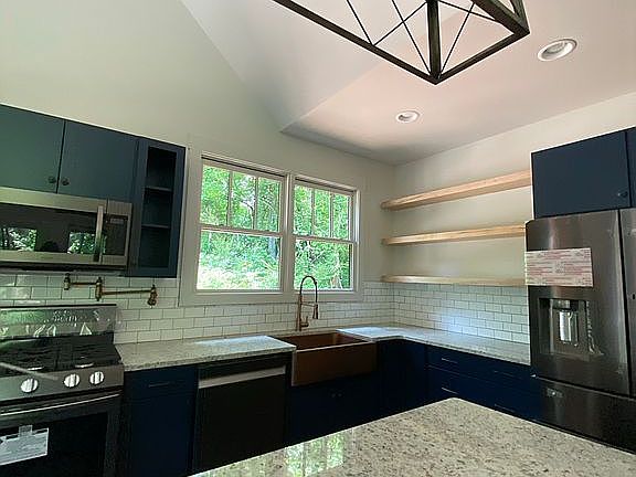Modern Farmhouse with contemporary kitchen, apron front hammered copper sink, & hand stained pantry barn door. Vaulted open space on main level with owner bedroom & bath, laundry room, guest bedroom, guest bath, kitchen, gas fireplace & nook. Living room leads to double sliding doors & covered deck. Deck is made of trex composite wood so there is no maintenance or repair ever needed. Handrail is 6 inches wide in order to hold a glass or plate when hosting large parties. Lower level has den/office space & full bath. 2 car garage as well as unfinished storage room. All flooring is bamboo and comes with lifetime warranty. Kitchen is designed with open shelving and Tuscan bronze appliances. Midnight cabinets & subway tile backsplash create a modern aesthetic. granite countertops and build in storage, trash/recycling,spice rack, deep drawers,& outlets in outlet that seats 3-6. Owner shower has built in bench for ultimate comfort. Large windows and gable windows give all types of sunlight inside, perfect for plant lovers & animal lovers alike.