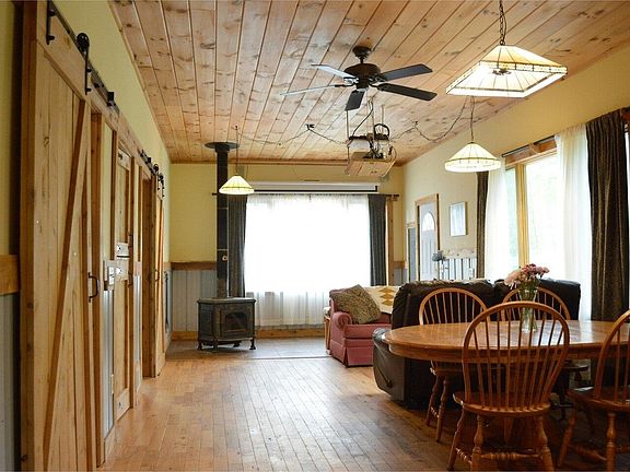 Set back from the road, this home sits amongst acres of woods, open spaces, & includes both a stream & walking trail! A tiled mudroom greets you at the front door with a cozy Hearthstone woodstove for extra comfort during VT's chilliest weather. Hardwood floors extend through the home, in addition to wood accent walls & metal wainscoting. The majority of the living space is wide open & filled with natural light thanks to the Southern exposure & 9' x 5' windows. The entry overlooks a living/dining space with the kitchen just behind, boasting freshly sanded & re-oiled butcher block counters. A tiled floor adds further detailing, & ample counter & cabinet space make this a wonderful place to cook or entertain. The majority of the home was constructed in 2016, but the bathroom was added on in 2022 & features radiant floor heat, tiled soaking tub with dual shower heads, custom water heater enclosure, & additional space for a laundry area. This bathroom/laundry room opens to the outside, main rooms of the house, & the primary bedroom. Both bedrooms feature reclaimed materials, natural woodwork, & light. Custom barn doors throughout. Outside, you'll find a huge open yard, fenced area, duck coop, shed, & carport style storage. High speed fiber optic broadband, easy access to the VAST trails, ability to subdivide, additional septic hookup, agricultural zoning, & brand new heat pump rated to 20 below zero (to be installed by closing)! Showings begin Monday 5/22.