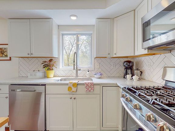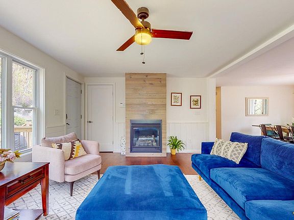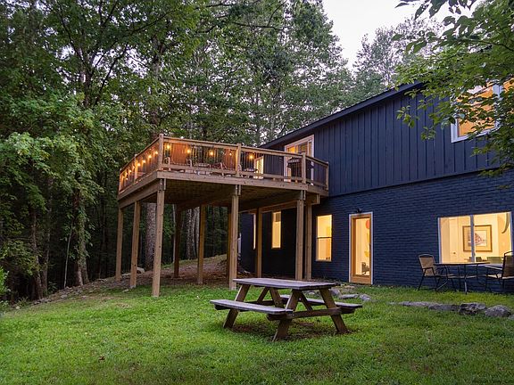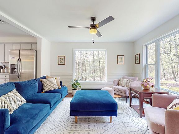 Bluestone Modern is a roomy retreat in a perfect full-time or weekend location––at the edge of the Bluestone Forest on a quiet road, yet just 10 min to both Woodstock and Kingston town centers. Two levels of living space were recently updated for modern living, offering flexible space for extended family, friends, hobbies, home office, gym equipment––or whatever else you can dream up! Enter the front door to the top level of the home, featuring a living room with gas fireplace and big picture windows, overlooking the fire pit and adjacent NYS land. This open-concept living area also includes a nicely appointed kitchen, and dining area that opens out via glass sliders to the expanded rear deck. Down the hall are three bedrooms, a shared bathroom, and another full bathroom en suite in the largest bedroom overlooking the blooming cherry tree. Down the interior stair, and past a colorful mural at the landing, you'll find another expansive living area with high ceilings, wet bar, and more colorful hand-painted wall murals. This level––with two bonus rooms and a brand new full bathroom––opens out to the rear yard, with picnic table, potting shed (or future writers cabin or studio space), and two more storage sheds for all your outdoor tools and toys. Plenty of parking round out this package, and many recent updates mean this will be a comfortable, efficient, and low-maintenance home for years to come. Dont miss seeing this special house and location, in one of the most sought-after communities in the eastern Catskills!