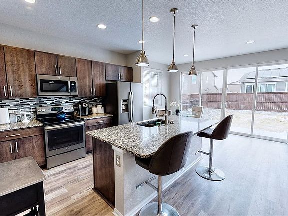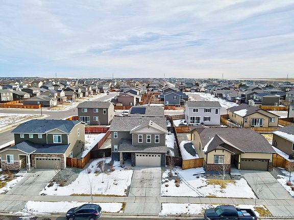 Wonderful opportunity to live in Traditions! This 3 bed/3 bath Richmond American Coral model has upgrades throughout and is situated near the large park, playground, basketball court and skate park. The main floor has a open floor plan with kitchen, dining, bathroom & living room. The kitchen features gorgeous granite counter tops, glass tile back-splash, additional pendant lighting, upgraded facet and a pantry & a large island with seating. The dining area has a large sliding glass doors that provides plenty of natural light. The patio was enlarged to accommodate outdoor dining/seating. Upstairs features open loft that could easily convert to a 4th bedroom, additional 2 bedrooms, hall bath, laundry & master suite. The master suite has a walk in closet & a shower with dual sinks and upgraded counter height! All bedrooms have been upgraded with ceiling fans. Home is pre-wired for surround sound. All appliance are included with the home, there is also radon mitigation and a water softener. Easy access to I-70 and E-470, Buckley AFB, DIA, schools, parks and Southlands Mall!